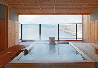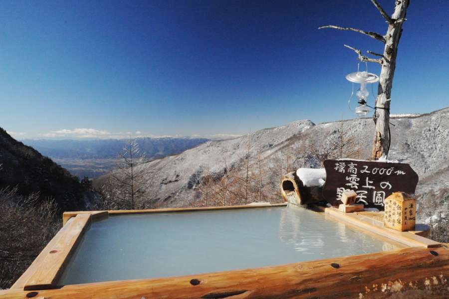 It’s early evening. The air is cool, and you can see your breath slightly in front of you. You step outside, and there it is—a steaming outdoor bath surrounded by trees.