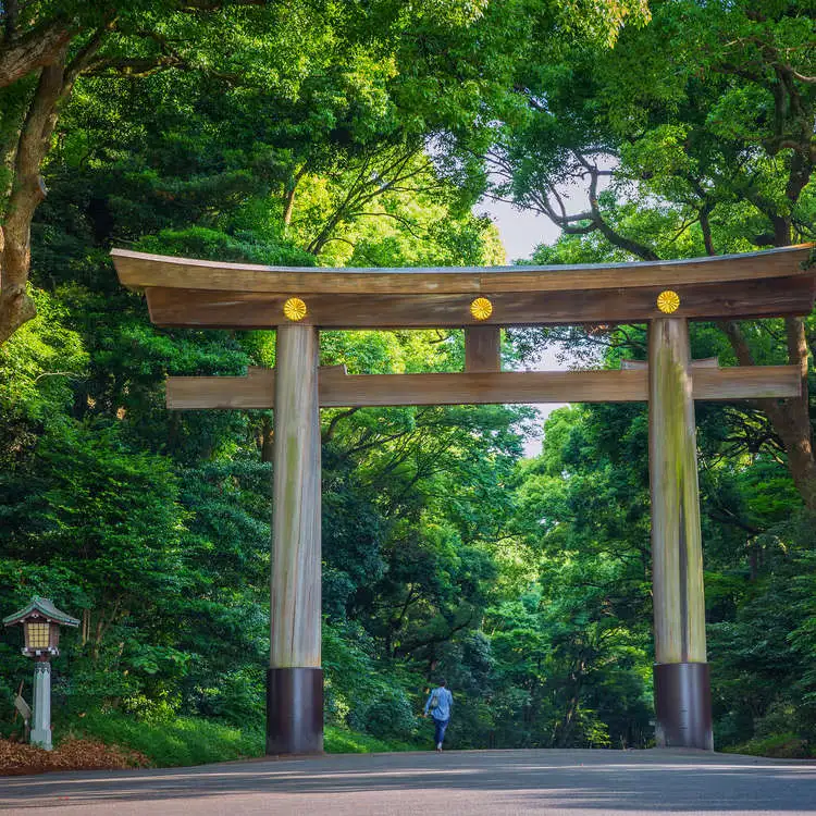 You pass through a tall, quiet gate, and suddenly the noise of the city fades behind you. The air feels different—cooler, softer. Tall trees surround you, and sunlight filters through the leaves.