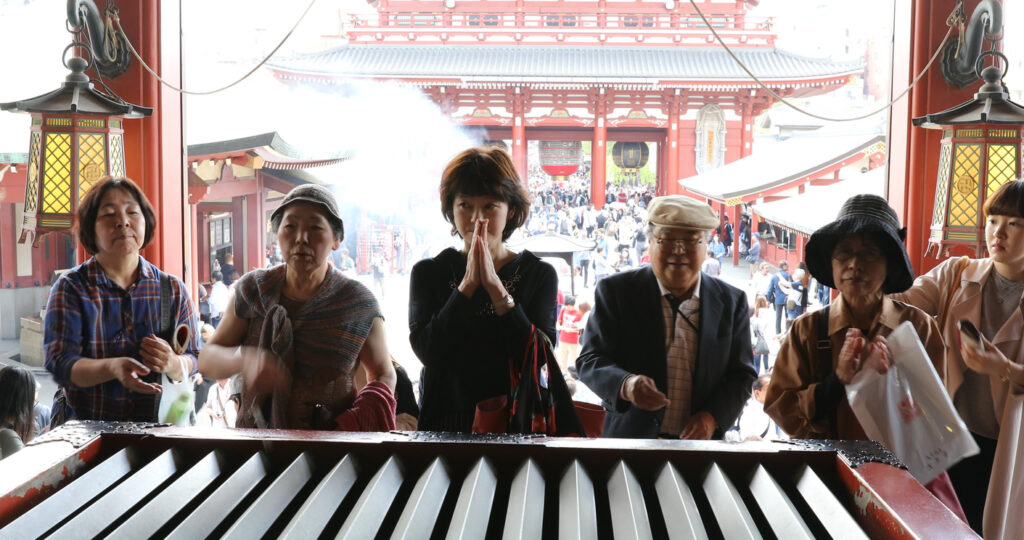 A deep bell echoes slowly through the air. The scent of incense drifts gently past you. People stand quietly, hands together, eyes closed for just a moment.